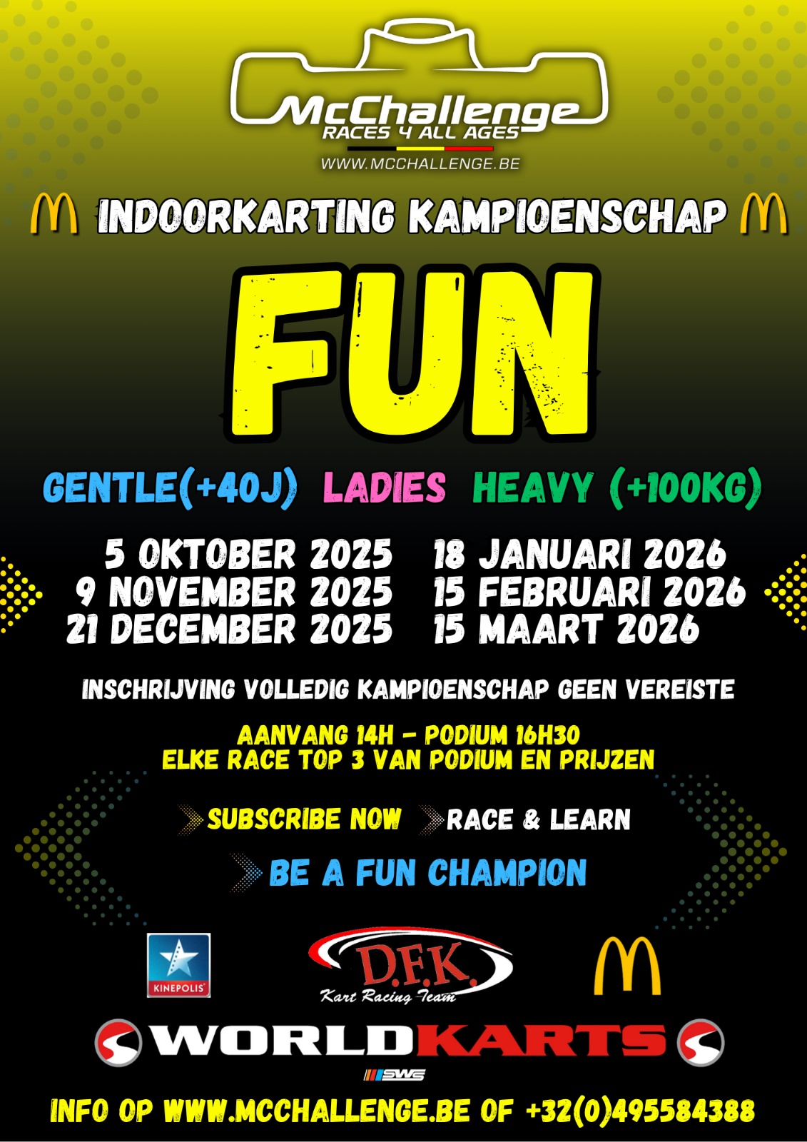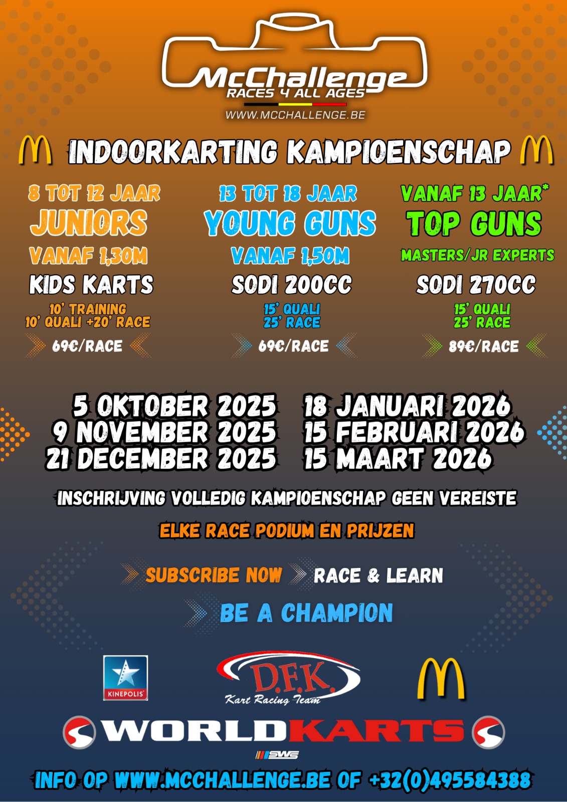 Karters, ongeacht hun ervaring of leeftijd een “real race” ervaring geven in een goed georganiseerd kader en gemoedelijke sfeer. Iedereen is welkom, Kids, Youngsters, Heren en Dames.